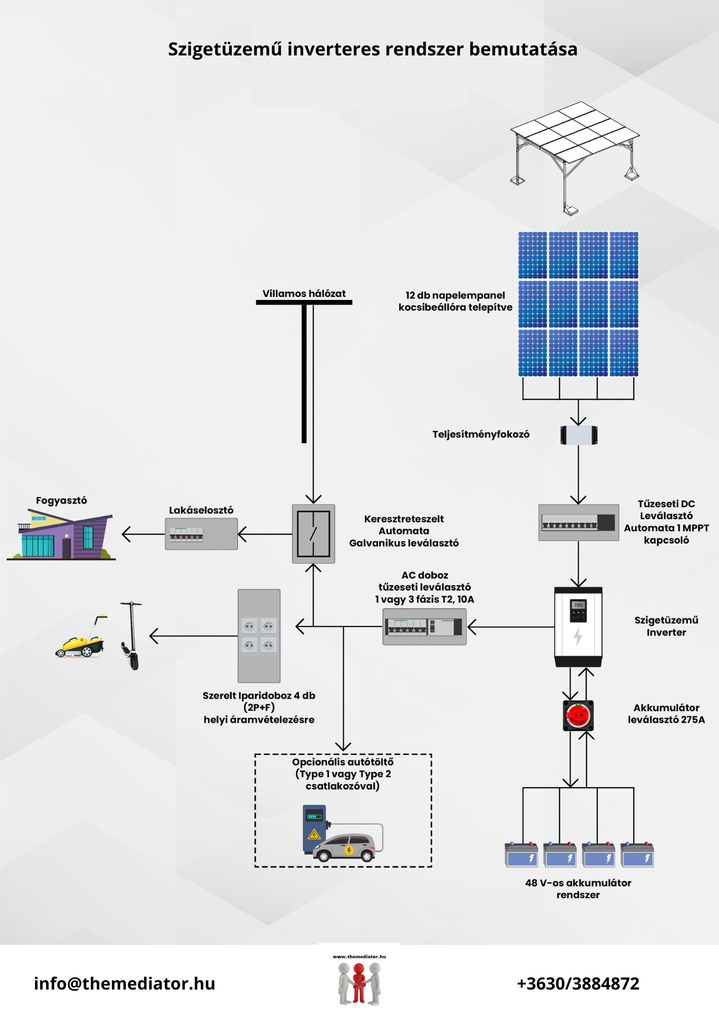 - Az Inverter optimalizálja az áramtermelést, biztonségi és védelmi funkciókat lát el, vezérli az akkumulátor töltését, adatgyűjtést és akár távfelügyeletet biztosít, igény esetén pedig még a saját fogyasztók ehógy részét is vezérelmi tudják